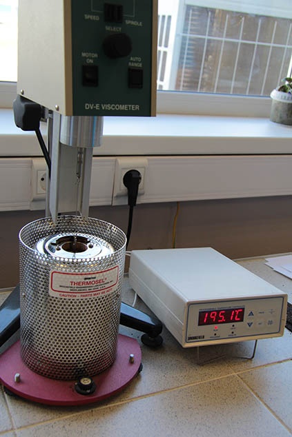 Важным параметром для оптимизации работы технологической линии является вязкость битумно-полимерного компаунда при различных температурах. Этот показатель определяется при помощи ротационного вискозиметра Брукфильда